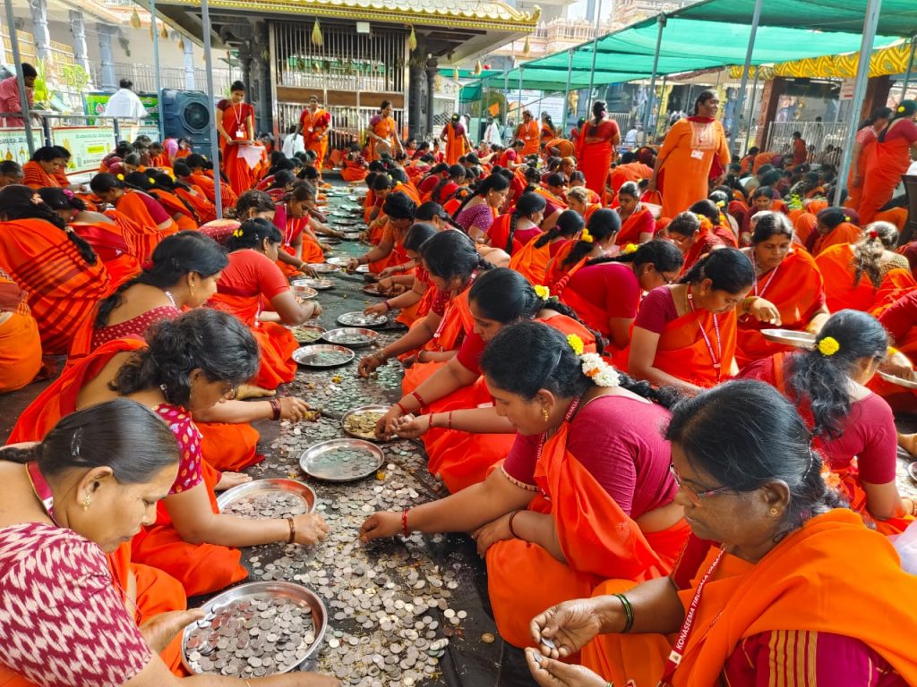 నవతరం, ఆత్రేయపురం: కోనసీమ తిరుమల వాడపల్లి వెంకటేశ్వర స్వామి వారి ఆలయంలో హుండీల లెక్కింపు కార్యక్రమం బుధవారం నిర్వహించారు. శ్రీ వెంకటేశ్వర స్వామి వారి, శ్రీ విశ్వేశ్వర స్వామి వారి ఆలయ హుండీల నుంచి మొత్తం రూ.1,46,07,768 రూ లు ఆదాయంగా లభించింది, అన్న ప్రసాదం హుండీల నుంచి రూ.59,43,236 ల ఆదాయం లభించింది, మొత్తం 34 రోజులకు గాను రూ2,05,51,004లు ఆదాయంగా లభించినట్లు డిప్యూటీ కమిషనర్ నల్లం సూర్య చక్రధరరావు తెలిపారు. నగదుతో పాటు 26 గ్రాముల బంగారం, 1kg 200 గ్రాముల వెండి కానుకలుగా లభించినట్లు ఆయన తెలిపారు. మొత్తం 14 దేశాలకు చెందిన 87 విదేశీ కరెన్సీ నోట్లు సైతం లభించినట్లు తెలిపారు. ఈ కార్యక్రమంలో ధర్మకర్తలు పెండ్యాల భవాని, చింతపల్లి సత్యనారాయణ, తమ్మన సాయి ప్రసాద్, సిస్ట్ల సూర్య కుటుంబరావు, మసకపల్లి త్రిమూర్తులు హాజరయ్యారు. అలాగే అర్చకస్వాములు, వేదపండితులు, గ్రామస్థులు, శ్రీవారి సేవకులు, పత్రికా ప్రతినిధులు, పోలీసులు, దేవస్థానం సిబ్బంది పాల్గొన్నారు. హుండీ ఆదాయం లెక్కింపుకు ఆంధ్రప్రదేశ్ గ్రామీణ బ్యాంక్ (లక్ష్మి పోలవరం) మరియు కెనరా బ్యాంక్ (రావులపాలెం) అధికారుల సహకారం అందించారు. ఈ సందర్భంగా ఆలయ ఛైర్మన్ ముదునూరి వెంకటరాజు (గబ్బర్ సింగ్) మరియు కార్యనిర్వహణాధికారి & డిప్యూటీ కమిషనర్ నల్లం సూర్య చక్రధరరావు మాట్లాడుతూ, భక్తుల విశ్వాసం మరియు సహకారంతో ఆలయ అభివృద్ధి కార్యక్రమాలు మరింత వేగంగా చేపడుతున్నామని తెలిపారు.