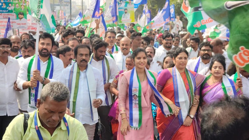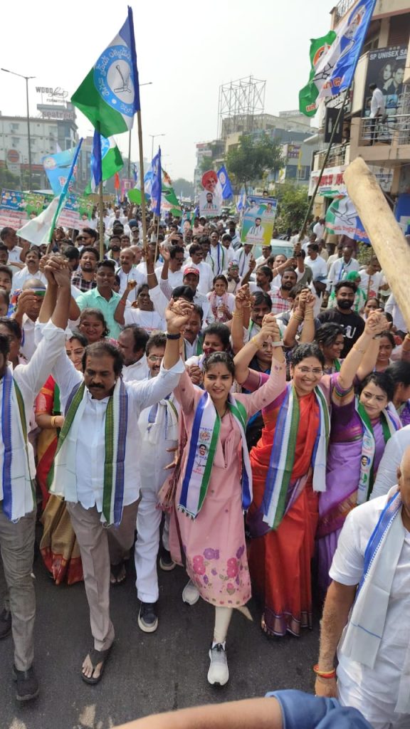 తన తండ్రి చిన్న శ్రీను గారు ఆదేశాలు మేరకు కోటి సంతకాలు ప్రతులు భారీ ర్యాలీ లో సిరమ్మ…!..