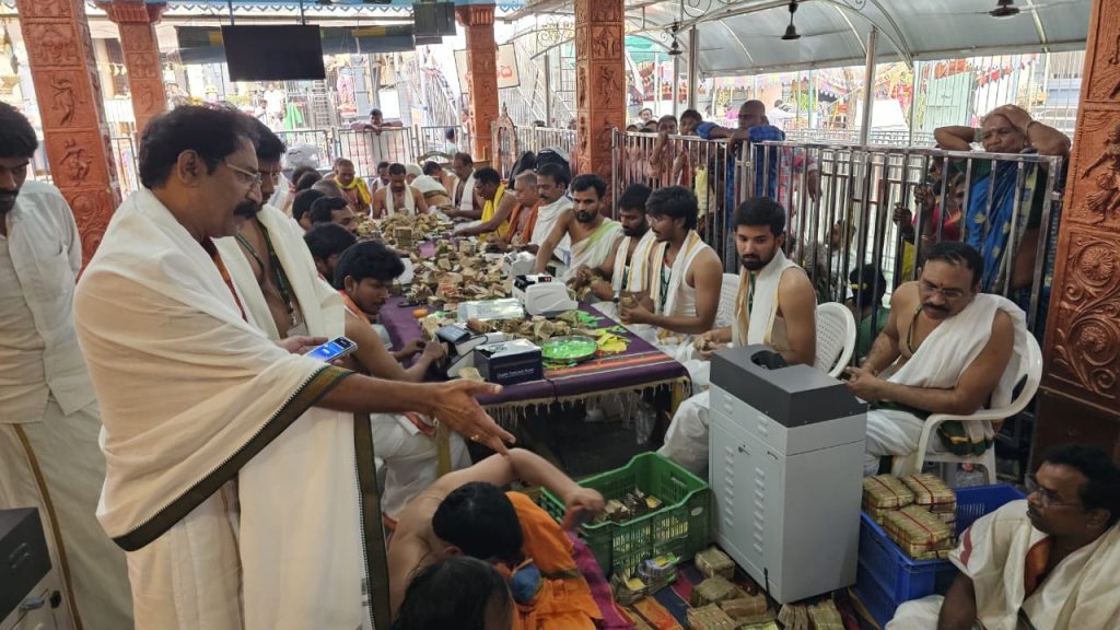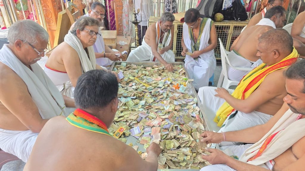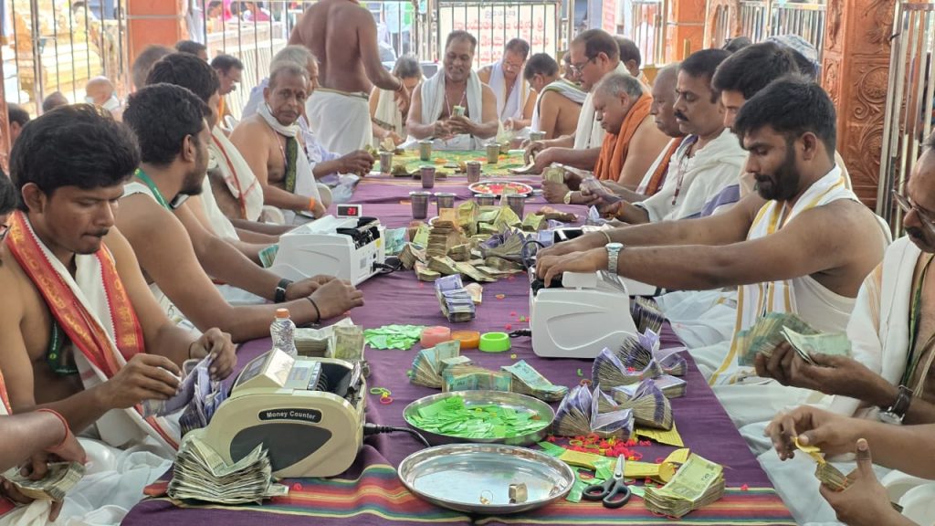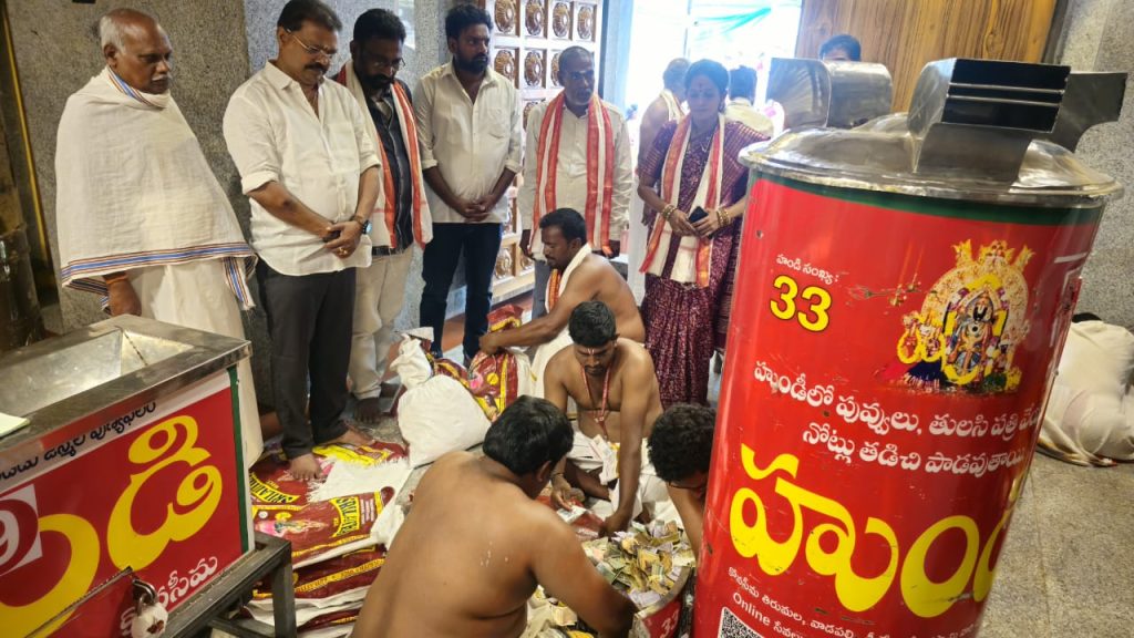 నవతరం, ఆత్రేయపురం: కోనసీమ తిరుమలగా ప్రసిద్ధిగాంచిన వాడపల్లి శ్రీ వేంకటేశ్వర స్వామి వారి ఆలయంలో గురువారం జరిగిన హుండీల లెక్కింపు కార్యక్రమంలో రికార్డు స్థాయిలో రూ. 2.17 కోట్ల ఆదాయం లభించింది. గత 35 రోజుల కాలానికి గాను ఈ మొత్తం లభించింది. ఇందులో శ్రీ వేంకటేశ్వర స్వామి వారి ప్రధాన ఆలయం మరియు శ్రీ విశ్వేశ్వర స్వామి వారి ఆలయ హుండీల ద్వారా రూ. 1,58,00,536/- నగదు, అన్నప్రసాదం హుండీల ద్వారా రూ.59,82,822ల నగదు లభించినట్లు ఆలయ అధికారులు తెలిపారు. అదేవిధంగా భక్తులు సమర్పించిన కానుకలుగా 42 గ్రాముల 400మిల్లీ గ్రాముల బంగారం, 1 కిలో 280 గ్రాముల వెండి, అలాగే 13 దేశాలకు చెందిన 73 విదేశీ కరెన్సీ నోట్లు హుండీలలో లభించాయని ఆలయ అధికారులు తెలిపారు. కార్యక్రమానికి ఆలయ ధర్మకర్తలు సి హెచ్ రాంబాబు, సలాది నాగేశ్వరరావు, పి. భవాని, సి హెచ్.సత్యనారాయణ, ఎస్ సూర్య కుటుంబరావు, ఎమ్ త్రిమూర్తులు హాజరయ్యారు. పర్యవేక్షణాధికారులుగా మందపల్లి శ్రీ మందేశ్వర స్వామి వారి దేవస్థానం అసిస్టెంటు కమీషనరు మరియు కార్యనిర్వహణాధికారి (ఎఫ్ ఏ7 సీ) డి సురేశ్ బాబు, పలివెల గ్రూపు 2 దేవాలయాల ఈవో పి వి వి ఎస్ కామేశ్వరరావు, ఆత్రేయపురం గ్రూపు 3 దేవాలయాల ఈవో బి నరేంద్ర కుమార్ వ్యవహరించారు. హుండీ ఆదాయం లెక్కింపుకు కరూర్ వైశ్య బ్యాంక్, రావులపాలెం, కెనరా బ్యాంక్, రావులపాలెం వారు సహకారం అందించారు. అలాగే అర్చకస్వాములు, వేదపండితులు, గ్రామస్థులు, శ్రీవారి సేవకులు, పత్రికా ప్రతినిధులు, పోలీసులు, దేవస్థానం సిబ్బంది పాల్గొన్నారు. ఈ సందర్భంగా కార్యనిర్వహణాధికారి, డిప్యూటీ కమిషనర్ నల్లం సూర్య చక్రధరరావు మాట్లాడుతూ ఈ సారి రికార్డు స్థాయిలో రూ2.17 కోట్ల ఆదాయం లభించిందని హర్షం వ్యక్తం చేశారు. దేవస్థానం పాలకమండలి చైర్మన్ ముదునూరి వెంకటరాజు మాట్లాడుతూ భక్తుల సహాయ, సహకారాలతో ఆలయంలో మరిన్ని అభివృద్ధి కార్యక్రమాలు చేపడతామని తెలిపారు.